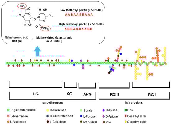 Schematic representation of pectin composed by smooth regions of homogalacturonan (HG), xylogalacturonan (XG), apiogalacturonan (APG), and hairy regions of rhamnogalacturonan-I (RG-I) and rhamnogalacturonan-II (RG-II). General structure of low and high methoxy pectin is also reported.