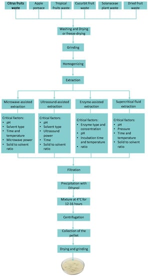 A flow diagram of the extraction of pectins from different food wastes is presented in Figure 2. Exploring the use of different extraction methods can enhance the extraction efficiency of this polysaccharide, thereby finding new sources for industrial applications. In Table 1, a summary of the highest extraction yields of pectin obtained from the different food waste sources reviewed is reported. The data presented can guide researchers towards promising sources that could be further investigated to meet the increasing demand of the sustainable pectin biopolymer.