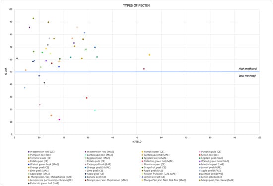 A graphical representation of the different types of pectins extracted (expressed as LMP and HMP) from various food wastes is illustrated, along with their corresponding degree of efficiency (expressed as the extraction yield). Each data point represents pectin derived from a specific food waste source, with a distinct extraction method.