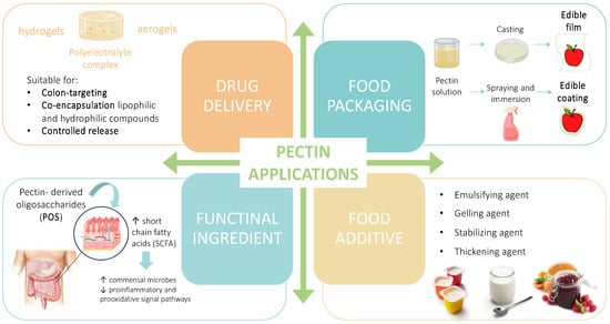 Pectin is traditionally used as a food additive to impart viscosity in jams and dairy products, but more recently LM pectin derived from citrus peel fruits has been found to be suitable for the formulation of low-calorie products, due to the low sugar content needed for gelation [51,110]. Moreover, several health claims have been assigned to pectin, supporting its use in functional food and food supplements. In this contest, POS derived from emerging food waste, such as from apple pomace [93] or artichoke byproducts [94], are gaining attention as a new generation of prebiotics with efficiency similar to that of the well-known FOS and GOS. Recently, pectin has also been reported to be an effective encapsulating agent for colon targeting in solid oral formulation, as it is resistant to an acidic gastric environment, preserving the release until the small intestine. By functionalizing pectin with other polymers (such as chitosan or oligochitosan) or proteins, formulations are stabilized and able to reach the colon undamaged, and therefore are suitable to deliver nutraceuticals in this district. Promising solutions have been found with pectins derived from watermelon rinds [100], yuzu [83], and citrus peels [84]. In addition, pectin meets the requirement as a new biodegradable and natural polymer in food packaging. Recently, citrus fruit waste pectin functionalization with polyphenols, essential oils, or antioxidant extracts provides antimicrobial or UV-light blocking capacities to food packaging, providing new smart packaging solutions [90,91,103].
