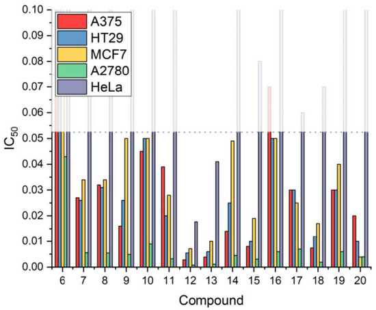 Cytotoxicity of compounds 6–20 for different human tumor cell lines.
