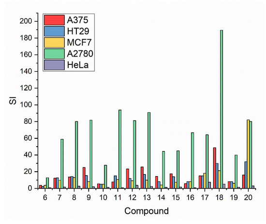 As a result, the A2780 cell line (ovarian cancer) proved to be the most sensitive for the piperazinyl spacer compounds 6–10, with the lowest EC50 values determined ranging from 0.043 μM to 0.0049 μM. When compared with non-malignant NIH 3T3 fibroblasts, a selectivity factor (calculated as the ratio EC50, tumor cell/EC50, NIH 3T3) of 82 was observed, indicating that this compound is more cytotoxic to cancer cells than to non-malignant cells. In this series of compounds, the butyl-substituted rhodamine-conjugated asiatic acid hybrid 9 also proved to be the best for A375 (melanoma) and HT29 (colon adenocarcinoma) cells. A summary of SI values is depicted in Figure 2.