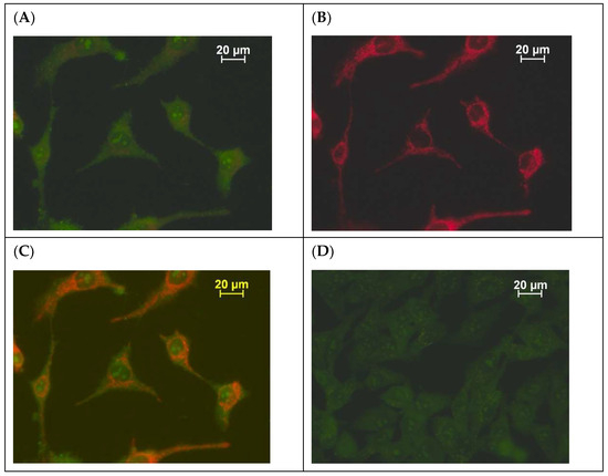 Incubation of A375 cells (48 h) with Mito Tracker green and compound 18: (A): detection of Mito Tracker green; (B): detection of compound 18; (C): merged pictures (A,B); (D) control.