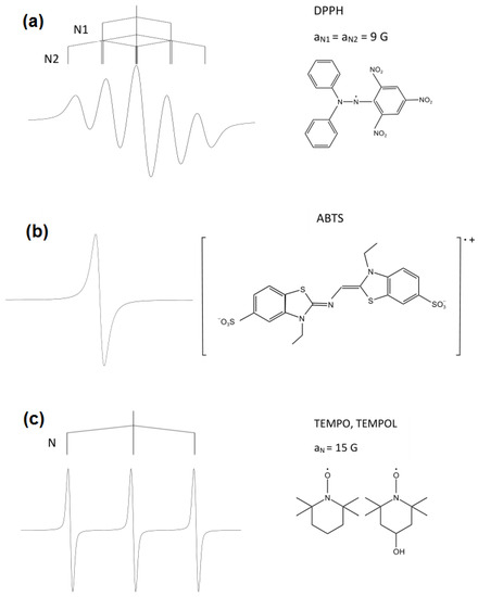 Chemical structures and hyperfine structure in the EPR spectrum of stable radicals commonly used to measure antioxidant capacity: (a) DPPH, (b) ABTS, (c) TEMPO, TEMPOL.