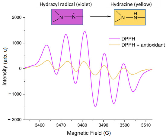 The EPR spectrum of DPPH· in a solvent consists of five lines almost equidistant, with relative intensities of 1:2:3:2:1, which mainly correspond to two equivalent nitrogen nuclei, with the hyperfine coupling constants (Figure 1a), where and are hyperfine coupling constants derived from equivalent nitrogen nuclei. The DPPH method involves adding this radical to an antioxidant sample and measuring the decrease in the EPR signal intensity of the radical as it is scavenged by the antioxidant (Figure 2). The main principle of this assay consists of detecting the reduction of to when DPPH accepts a hydrogen (H) atom from the scavenger molecule, i.e., the antioxidant. The respective concomitant decrease in absorbance leads to a colour change from purple to yellow. At the same time, the usage of EPR spectroscopy for monitoring the antioxidant capacity is relatively scarce. Among the known studies, one can list investigations of tea leaves [37,38,39], coffee [40], wine [58,59,60,61,62], honey [41], beer [42], tinctures [43], and fruits and vegetables [43,44].