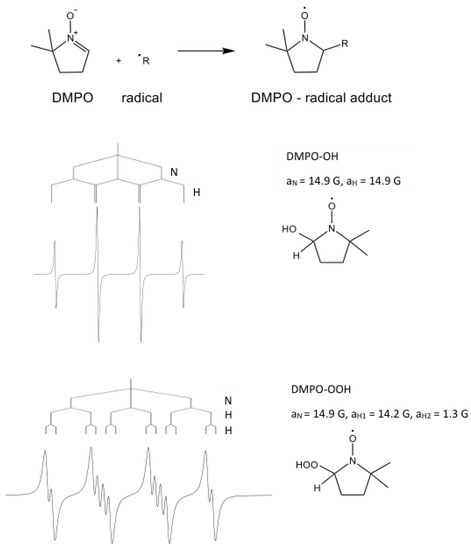The direct detection of reactive oxygen species (ROS) playing a critical role in many biological processes, such as , , , , , and , is not possible by EPR spectroscopy, because the ROS are short-lived and do not accumulate. The study of these radicals is possible using spin-trapping techniques [89]. This method consists in the ROS being “trapped” or stabilized by the addition of a radical spin trap, which forms a stable adduct with the radical, which lives long enough for the spin trap adduct to be measured by EPR. Among the widely used spin traps applied for the study of oxygen-centred free radicals in biochemical and biological systems is 5,5-dimethyl-1-pyrroline N-oxide (DMPO). It allows the exploration of the formation of superoxide () and hydroxyl radicals () as well as peroxyl radicals [89]. Figure 3 demonstrates that the spectra of spin adducts of selected DMPO radicals are different; the number of lines in the EPR spectrum and coupling constants changes depending on the trapped radical.