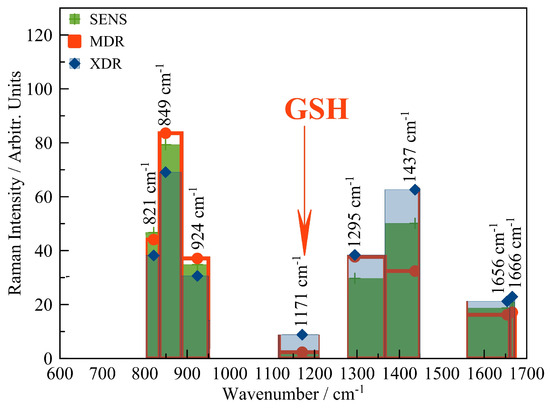 Apart from the purely data-based research, which utilises big data and various machine learning approaches for distinguishing between drug-susceptible and drug-resistant strains of M. tuberculosis, there is also a series of work focused on the revealing specific molecular features of the cell wall, which explain the difference in the investigated Raman spectra underlying the classification process. They started from the work [131], where six spectra of clinical samples of sensitive, multidrug-resistant, and extensively drug-resistant MbT (Beijing family) isolated from respiratory and surgical material were obtained and analysed. It was concluded that the different statuses of drug resistivity could exhibit themselves in a varying amplitude of certain bands belonging to both cell walls and DNA, see Figure 4. The former was investigated in more detail in subsequent work [132]. The results of this study argue that the desired difference can be detected in the high wave number region corresponding to the vibrational stretching of lipids and proteins. This supports the importance of characterising the specificity of the lipid-based constituents of the cell envelope by different methods, including those which are considered in the present review. As another promising target, glutathione was revealed [133] in the region of moderate wave numbers (1000–1500 ). Figure 4 highlights one of the spectral lines belonging to the glutathione spectrum, which is a rather stable representative of this molecule under various conformations and external conditions [134,135] and, simultaneously, clearly exhibit the regular amplitude growth when M. tuberculosis has extra drug resistivity. From the biochemical point of view, it is well known as one of the key natural cellular antioxidants [136] also actively involved in the process of tuberculosis infection [137] and curing [138]. Thus, this fact is an argument in favour of studying the complex joint molecular processes in cells’ envelopes and the molecular biochemistry of antioxidative compounds.