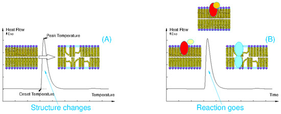 Examples of typical DSC curves, which reflect (A) a thermal response to a structural change exemplified as emerging membrane fluidity and (B) time course of the isothermal DSC curve emerging due to a biochemical binding of two compounds.