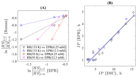 (A) An illustration of the linear correlations between the kinetic constant defining the quasi-first-order model for azide binding to myoglobin as determined by resonance Raman and electron paramagnetic resonance spectroscopies under different conditions (the temperature of frozen samples and azide’s concentration). The digitized and reprocessed data reported in the work [185] were used for this plot. (B) An illustration of the linear correlation between the induction period of oxidation in different vegetable oils determined by the EPR and DSC methods. The data of two repetitive experiments (blue squares, solid line; black diamonds, dashed line) reported in the work [180] were processed and used for this representation.