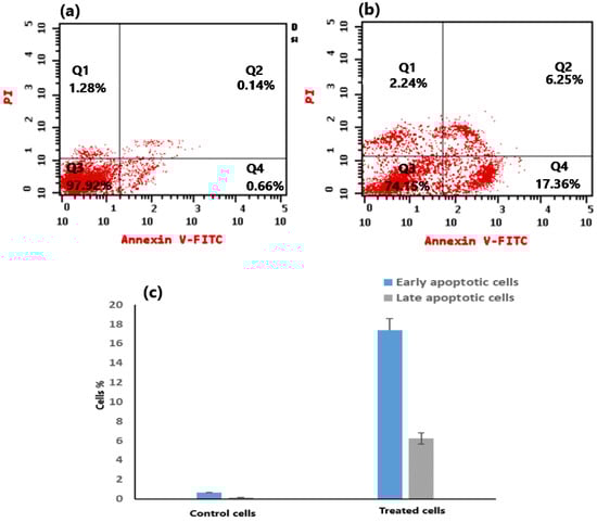 - The ability of compound 4 to cause apoptosis and damage DNA in MCF-7 cells was tested with Annexin V/PI and comet analyses. Figure 5a,b illustrate the outcomes of flow cytometry analysis using annexin V/PI staining for cells treated with compound 4, as compared to untreated cells. The proportion of apoptotic cells (including both early and late stages) was found to be significantly higher in the compound 4-treated MCF-7 cells in comparison to untreated ones. Moreover, the % of both early and late apoptotic cells in compound 4-treated cells in comparison to untreated ones is displayed in Figure 5c.