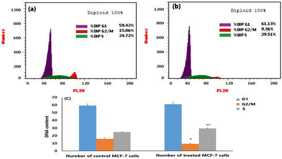 One of the most important strategies for halting the expansion of cancer cells is to disrupt their normal cell cycle progression [30]. Thus, by using flow cytometry, it was probable to analyze the influence of compound 4 on the control of the MCF-7 cell cycle progression. As seen in Figure 7b, compound 4 generated a greater number of cells in the S phase in treated MCF-7 cells as compared to the MCF-7 control cells (Figure 7a), confirming the arresting of the cell cycle at the S phase that triggers apoptosis. It is possible that this occurred because of an interruption in DNA synthesis, which would have stopped the cell cycle and led to apoptosis. In addition, Figure 7c depicts a standard histogram comparing control and compound 4-treated MCF-7 cells at each stage of the cell cycle.