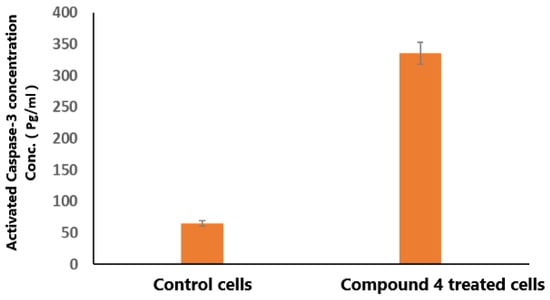 The expression levels of the human active caspase-3 protein when cleaved at Asp175/Ser176 were measured in compound 4-treated MCF-7 cells, using an ELISA method (Invitrogen, Waltham, MA, USA, Catalog # KHO1091). In a nutshell, after incubating the tested compound 4 with MCF-7 cell cultures for 2 h, the supernatant (100 μL) was plated into a 96-well ELISA plate, and the resulting pellets were discarded. Each well was then suspended with 100 μL of a caspase-3 (active) antibody detection solution and left to incubate at room temperature for 1 h. The solution was then decanted from the wells and rinsed four times. Furthermore, HRP-Anti-Rabbit Antibody solution (100 µL) was added to each well, and the plate was incubated for 30 min at room temperature. A stabilized chromogen substrate (100 µL) was transferred to each well, and the plate was allowed to incubate for 30 min at room temperature, in darkness. At 450 nm, optical density readings were taken from the tested plate after adding 100 µL of stop solution to each well. Utilizing a standard curve, the quantity of active caspase-3 protein in the treated MCF-7 cells was calculated.