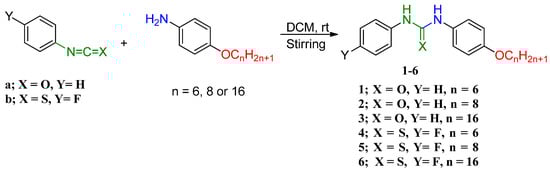 N,N′ disubstituted Urea and N,N′ disubstituted thiourea derivatives 1–6 were synthesized through direct reaction between equimolar amounts of either Phenylisocyanate or 4-fluorophenylisothiocyanate with alkoxy anilines, namely, 4-hexyloxyaniline, 4-octyloxyaniline or 4-hexadecyloxyaniline in dichloromethane at room temperature, as shown in Scheme 1. The infrared spectrum of compounds 1–6 displayed N-H stretching absorption peak in the region 3200–3320 cm−1. Moreover, the absorption due to the aliphatic C-H stretching appeared as absorption bands in the region 2920–2964 cm−1. Additionally compounds 1–3 exhibited sharp absorption peak in the region 1640–1650 cm−1 that corresponds to the carbonyl group stretching. The terminal alkoxy group protons could be detected in the proton NMR spectra with chemical shifts ranging from 0.82 to 3.99 ppm. In addition, the corresponding saturated aliphatic carbons of each of these compounds had signals in the carbon NMR spectrum within the range of 14–68 ppm. In addition, the benzene rings of compounds 1–6 have been detected utilizing NMR spectra of both protons and carbons. Accordingly, as a prototype, the aromatic protons of 4 appeared in proton NMR as two doublets, a doublet of doublets and a pseudo triplet (pst), and each of them represent two protons. The pair of doublets of equal area represent the four protons of the aryl ring bearing the alkoxy group. The doublet-of-doublet signal was observed for the two protons of the other fluorinated aromatic ring due to three-bond coupling with the neighboring aromatic proton (3JH,H = 9.0 Hz) and four-bond coupling with the fluorine atom (4JH,F = 5.0 Hz), and this peak has been ascribed for the two protons in meta position relative to the fluorine atom. The pseudo-triplet (pst) signal has been assigned to the two protons in ortho positions relative to the fluorine atom. The nearly equal three-bond coupling with nearby protons and fluorine atoms (3JH,H ≈ 3JH,F ≈ 8.8 Hz) may explain why the pst signal was observed rather than a doublet-of-doublet signal.