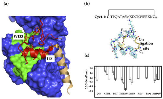 In addition to constraining its conformation, this cyclic peptide was also subjected to sequence optimization, as PPI interface residues with high specificity may have only modest affinity [35]. To identify affinity-enhancing mutations, we used the Rosetta flex ddG protocol, which systematically substitutes all twenty amino acid residues at each position and estimates the effects of substitutions on binding energies [36,37,38]. Before the actual redesign procedure, we replaced the hot spot I2 of the cyclic peptides (corresponding to I121 in the dimer structure) with a threonine intended to function as an N-terminal capping of the short helix, which might provide more stability than a hydrophobic residue at the beginning of a short peptide [39]. This cyclic peptide, cyc1-1 (C1TPQATASMKDGKWERKKC19), served as a starting point for the structure-based sequence optimization, which entailed calculations for each remaining position, other than the disulfide linkage, in order to get an overall view of the mutations with improved binding affinities. In the calculations, we identified Q4D, A7L/E/K, S8T/L, K10R/L/W, D11/R/N, K13S, E15Q, and R16E/Q/W as the most beneficial mutations, as compared to the native amino acid residues (Figure 1c). One or more of these putatively beneficial substitutions were introduced into the cyclic peptides, which were then synthesized for experimental evaluation.