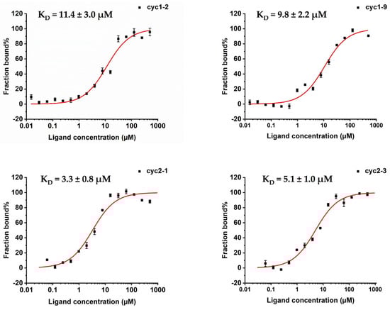 The dose-response binding curves of the representative cyclic peptides in the MST assays. Data shown represent the mean ± SD (n = 3).