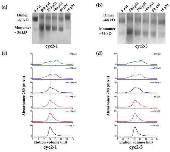 As our peptides are designed specifically to bind to the inactive monomer and then shift the dimer-monomer equilibrium, we then measured the oligomerization state of sPHGDH in the presence of peptides using chemical cross-linking experiments. As seen in Figure 3, sPHGDH exists predominantly as a dimer with a small fraction remaining in its monomeric form when no peptide was present (0 μM). A significant dimer-disruptive effect was observed at a 10 μM concentration for the measured peptides, including cyc2-1 and cyc2-3. We also observed a dose-dependent blocking of dimer formation, with dimers and monomers existing in dynamic equilibrium. We found that decreases in the prevalence of the dimer form corresponded to proportional increases in the monomer form at increasing concentrations of peptides, ranging from 10–500 μM. At a peptide concentration of 500 μM, the oligomerization equilibrium of both cyclic peptides shifted to strongly favor the monomer state in contrast to the dimer-dominated equilibrium in the system without peptides. These results show clearly that the designed peptides bind to and stabilize a small population of the monomer, steadily increasing the prevalence of the monomeric form and eventually shifting the dimer-monomer equilibrium toward the inactive monomeric state. Together, our results suggest that cyclic-constrained peptides developed based on the loop region of the dimer interface are sufficient and effective for the inhibition of the enzyme activity of PHGDH, through directly binding to the monomeric form and disrupting the monomer-dimer equilibrium.