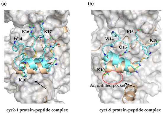 Binding mode analysis of representative single and double constrained peptides. (a,b) comparison of the binding conformation of peptide cyc2-1 (cyan) or cyc1-9 (cyan) in the protein-peptide complex extracted from MD trajectories, with the original segment (light orange) truncated from the crystal structure (PDB code: 2G76), and the binding protein surface is colored grey. Hydrogen bond interactions are shown by the green dashes, and the arrow indicates that the helix of the protein-peptide complex binds more closely than that in the homo-dimer structure. The red circle in (b) shows an unfilled pocket present in the protein-peptide complex.