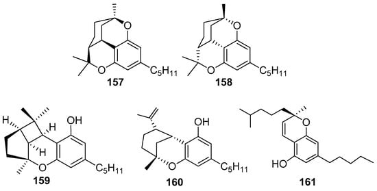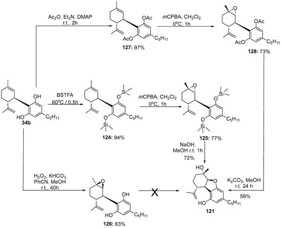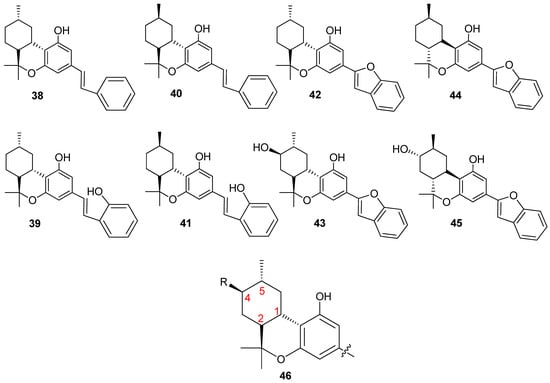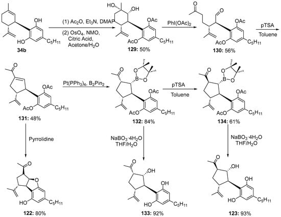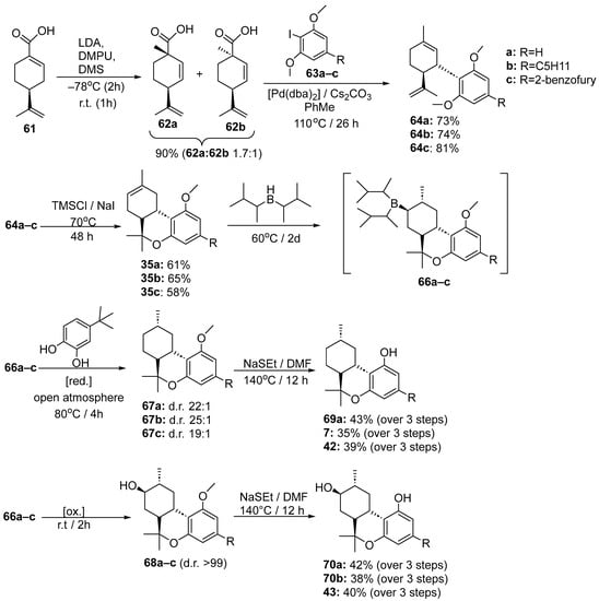 Synthesis of (6aR,9S,10aS)-6,6,9-trimethyl-6a,7,8,9,10,10a-hexahydro-6H-benzo[c]chromen-1-ol (69a), (6aR,8R,9R,10aS)-6,6,9-trimethyl-6a,7,8,9,10,10a-hexahydro-6H-benzo[c]chromene-1,8-diol (70a), (6aR,9S,10aS)-6,6,9-trimethyl-3-pentyl-6a,7,8,9,10,10a-hexahydro-6H-benzo[c]chromen-1-ol (7), (6aR,8R,9R,10aS)-6,6,9-trimethyl-3-pentyl-6a,7,8,9,10,10a-hexahydro-6H-benzo[c]chromene-1,8-diol (70b), (6aR,9S,10aS)-3-(benzofuran-2-yl)-6,6,9-trimethyl-6a,7,8,9,10,10a-hexahydro-6H-benzo[c]chromen-1-ol (42), and (6aR,8R,9R,10aS)-3-(benzofuran-2-yl)-6,6,9-trimethyl-6a,7,8,9,10,10a-hexahydro-6H-benzo[c]chromene-1,8-diol (43) developed by Studer [].