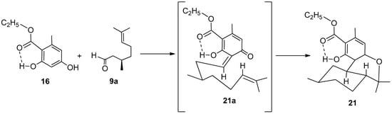 Compounds 21, 22, and 26 were obtained with higher yields than 20 and 25 for the presence of a carbonyl group in the ortho-position related to one of the hydroxyl groups on the phenyl ring. This fact can be elucidated due to the hydrogen bond between the hydroxyl group and the carbonyl group of the ethyl ester conferring a higher regiospecificity to the cyclization reaction, which is likely to occur at the position without hydrogen bonding. On the other hand, the stereospecificity during the intramolecular Diels–Alder reaction could be explained considering that in the transition state (21a), the methyl group adopted a coplanar structure in the chair configuration, so the exo-transition state is energetically more favorable than the endo-transition state, as shown in Scheme 3.