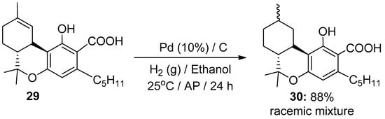 The most common partial synthesis of HHC methodology is through the hydrogenation reaction of Δ9THC or its isomers Δ8THC and Δ10THC. Scialdone [] reported the hydrogenation of cannabis oil produced with extraction of Cannabis sativa. The cannabis extract enriched with (6aR,10aS)-1-hydroxy-6,6,9-trimethyl-3-pentyl-6a,7,8,10a-tetrahydro-6H-benzo[c]chromene-2-carboxylic acid (THCA-29) was dissolved in absolute ethanol and treated with 10% Pd/C and hydrogen gas at room temperature and atmospheric pressure (AP), stirring overnight. The racemic mixture of diastereomers (6aR,10aS)-1-hydroxy-6,6,9-trimethyl-3-pentyl-6a,7,8,9,10,10a-hexahydro-6H-benzo[c]chromene-2-carboxylic acid (30) was obtained with 88% (Scheme 4).