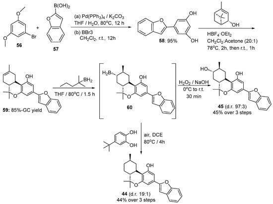 Moreover, Studer [] reported the synthesis of (−)-machaeriol B (44) and (−)-machaeriol D (45) focusing on the Friedel–Crafts alkylation of 5-(benzofuran-2-yl)benzene-1,3-diol (58), which was obtained in a 95% yield via the Suzuki–Miyaura cross-coupling reaction between 56 and 57, with (S)-cis-verbenol, followed by the cyclization that enables the building of the tetrahydrodibenzopyran motif of Δ8THC. (6aR,10aS)-3-(benzofuran-2-yl)-6,6,9-trimethyl-6a,7,8,10a-tetrahydro-6H-benzo[c]chromen-1-ol (59) was accomplished with 85% of yield. The next step was the hydroboration of the double bond in 59. To achieve a high diastereoselective reaction, they used thexylborane followed by oxidation with sodium hydroxide and peroxide to afford (6aR,8S,9S,10aS)-3-(benzofuran-2-yl)-6,6,9-trimethyl-6a,7,8,9,10,10a-hexahydro-6H-benzo[c] chromene-1,8-diol (45) in a 45% overall yield for the last three steps (cyclization/hydroboration/oxidation) with 97:3 selectivity (measured using GC-FID) (Scheme 8).