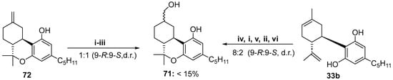 There are some reports that have described the partial synthesis of 11-hydroxyhexahydrocannabinol as a mixture of diastereomers. The first one was developed by Skinner [] starting from (6aS,10aR)-6,6-dimethyl-9-methylene-3-pentyl-6a,7,8,9,10,10a-hexahydro-6H-benzo[c]chromen-1-ol (72) in three steps with 1:1 (dr, 9R:9S). The second one was established by Kozela [] beginning with CBD (33b) in five steps with 8:2 (dr, 9R:9S) (Scheme 10). The overall yields in both synthetic routes are lower than 15%.