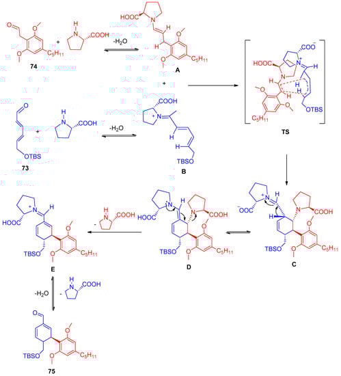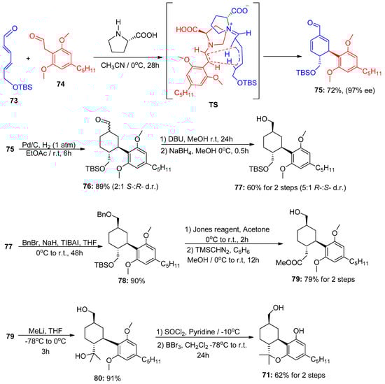 The first total synthesis of compound 71 was reported by Appayee [] applying the inverse-electron-demand Diels–Alder reaction to afford, stereoselectively, six-membered ring compound 75 starting with 6-((tert-butyldimethylsilyl)oxy)hexa-2,4-dienal (73) and 2-(2,6-dimethoxy-4-pentylphenyl)acetaldehyde (74) and catalyzed by (S)-pyrrolidine-2-carboxylic acid. (1R,6R)-6-(((tert-butyldimethylsilyl)oxy)methyl)-2′,6′-dimethoxy-4′-pentyl-1,6-dihydro-[1,1′-biphenyl]-3-carbaldehyde (75) was obtained with a 72% yield and 97% enantioselectivity.