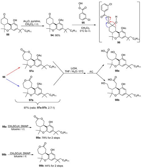 The synthetic pathway started with the acetylation reaction to protect the hydroxyl group in nabilone (88) obtaining (6aS,10aR)-6,6-dimethyl-3-(2-methyloctan-2-yl)-9-oxo-6a,7,8,9,10,10a-hexahydro-6H-benzo[c]chromen-1-yl acetate (94) with 90% of yield. It was afterward treated with 3-chlorobenzoperoxoic acid (95) to furnish a mixture of regioisomeric lactones 97a and 97b in a 97% yield after Baeyer–Villiger rearrangement via tetrahedral intermediate 96 (Scheme 14).