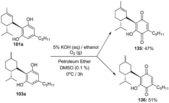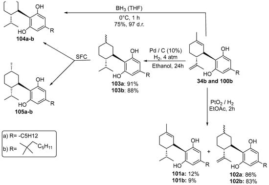 Ben-Shabat [] reported the partial hydrogenation of CBD (34b) and dimethyl-cannabidiol (CBD-DMH, 100) using Adam’s catalyst (PtO2) to afford a mixture of (1′R,2′S)-2′-isopropyl-5′-methyl-4-pentyl-1′,2′,3′,4′-tetrahydro-[1,1′-biphenyl]-2,6-diol (101a) from CBD or (1′R,2′S)-2′-isopropyl-5′-methyl-4-(2-methyloctan-2-yl)-1′,2′,3′,4′-tetrahydro-[1,1′-biphenyl]-2,6-diol (101b) from CBD-DMH (propen hydrogenated position), and 2-((1S,2R)-5-methyl-2-(prop-1-en-2-yl)cyclohexyl)-5-pentylbenzene-1,3-diol (102a) from CBD and 2-((1S,2R)-5-methyl-2-(prop-1-en-2-yl)cyclohexyl)-5-(2-methyloctan-2-yl)benzene-1,3-diol (102b) from CBD-DMH (C-5′ hydrogenated position), being products 102a and 102b of the predominant epimers (86% and 83%, respectively) (Scheme 16).