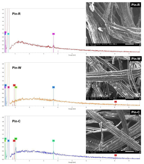 The activation of materials with sodium carbonate is a process proposed by the industrial partner to activate carboxylic functions. Preliminary studies have shown that this type of activation leads to changes in both the structure of materials and their chemical composition, in line with numerous published studies on the subject [13,14,15,44]. SEM images and EDS spectra of maritime pine materials in raw (Pin-R), washed (Pin-W) and sodium carbonate-activated (Pin-C) forms are shown in Figure 1. In the spectrum of the Pin-R sample, the presence of the calcium signal can be observed, which disappears after a simple water wash. For the Na2CO3-activated sample (Pin-C), a new sodium signal is observed. SEM images also show a smoother, softer surface for Pin-W and Pin-C materials. Some fine elements observed onto the fibers generate during mechanical processing are washed away.