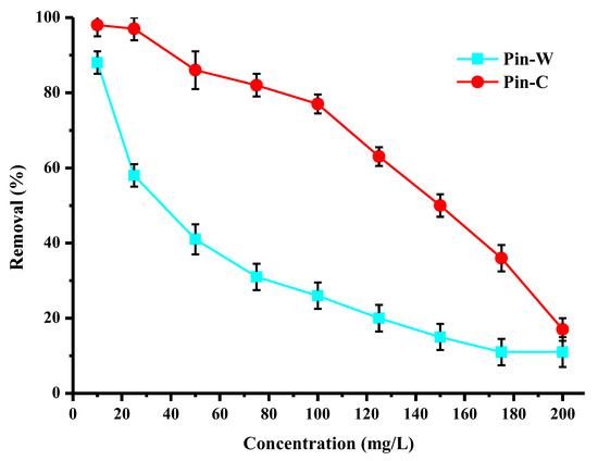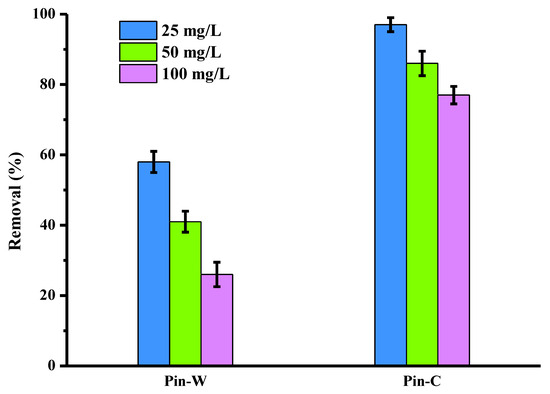 Effect of the initial copper concentration on the purification performance (expressed in % of removed copper) of washed (Pin-W) and activated (Pin-C) pine materials (other conditions: volume of solution = 100 mL; mass of material = 1 g; contact time = 120 min; T = 22 ± 1 °C; pHi = 4.7–5.6 ± 0.1; stirring = 250 rpm; n = 3).