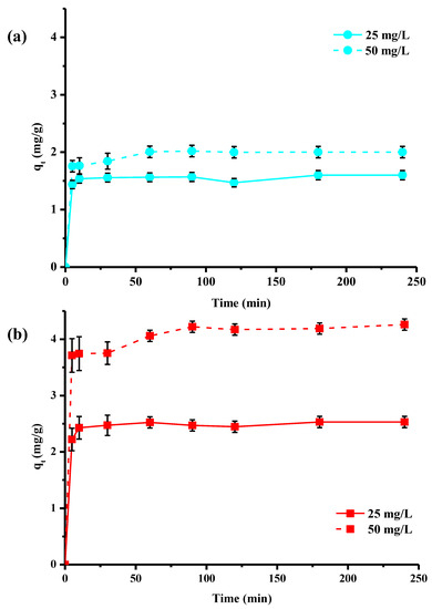 Kinetics of adsorption of copper ions by washed Pin-W (a) and activated Pin-C (b) pine materials at two different concentrations, 25 and 50 mg/L (other conditions: solution volume = 100 mL; mass of material = 1 g; T = 22 ± 1 °C; pHi = 5.2–5.4 ± 0.1; stirring = 250 rpm; n = 3).