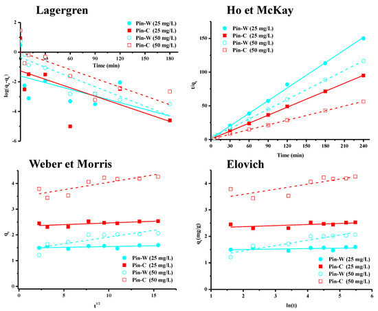 Graphical representations of the kinetic models of Lagergren, Ho and McKay, Weber and Morris, and Elovich for Pin-W washed pine and Pin-C activated pine materials at two different concentrations, 25 and 50 mg/L.