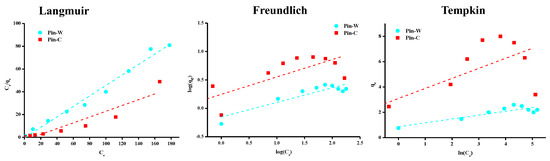 To determine the theoretical isotherm followed by copper adsorption by maritime pine fibers and predict, by calculation, the maximum adsorption capacity (qm) of this material, three empirical equations were applied: Langmuir [58], Freundlich [59], and Temkin [60]. The simplest model used in the literature to describe adsorption properties is that proposed by Langmuir. This simplified model is given by Equation (7), where qe represents the equilibrium adsorption capacity (mg/g), Ce is the equilibrium concentration (mg/L) and K is the Langmuir constant (L/g). Its graphical representation enables us to estimate the maximum adsorption capacity of a given material (qm in mg/g), corresponding to adsorbent saturation [58]. According to the assumptions of this model, the following information can be deduced: uniform material surface, localized adsorption on a fixed number of sites, instantaneous and reversible reaction, identical active sites capable of binding only one pollutant, no interaction between pollutants, constant adsorption energy and monolayer adsorption with the existence of a saturation plateau value [3,48,50].
