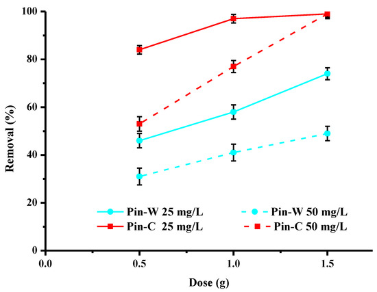 Effect of the mass of adsorbent used on copper abatement (expressed in % of removed pollutant) by washed (Pin-W) and activated (Pin-C) pine materials at two different concentrations, 25 and 50 mg/L (other conditions: volume of solution = 100 mL; contact time = 120 min; T = 22 ± 1 °C; pHi = 5.2–5.4 ± 0.1; agitation = 250 rpm; n = 3).