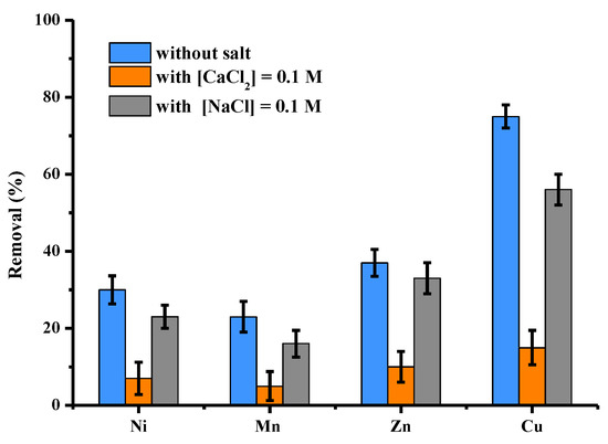Comparison between adsorption capacities (expressed in % of removed pollutant) of activated pine material towards 4 cations (Ni, Mn, Zn and Cu) present in polycontaminated solution at a total concentration of 100 mg/L in the presence or without CaCl2 and NaCl (other conditions: volume of solution = 100 mL; mass of material = 1 g; individual concentration of each cation = 25 mg/L; [Na+] = [Ca2+] = 0.1 mol/L contact time = 120 min; T = 22 ± 1 °C; stirring = 250 rpm; pH = 5.3 ± 0.1; n = 3).