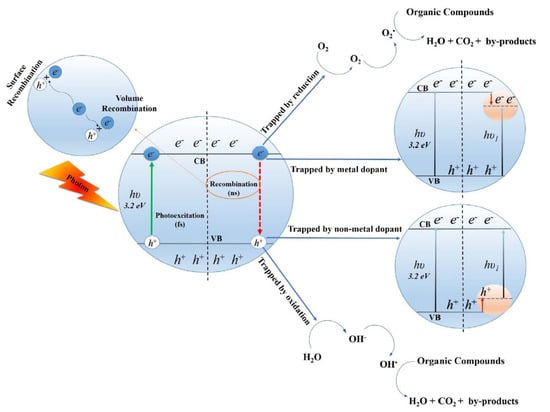 Electron–hole pairs can recombine instead of participating in surface reactions [37], which reduces the efficiency of the photocatalytic reaction. It is important to prevent recombination by improving the separation of electrons and holes via doping, precipitation of cocatalysts, or via “hetero-structuration”. Using nanomaterials can greatly improve how electrons reach the surface of the catalyst, thus reacting with electron acceptors in a shorter transfer distance [3].