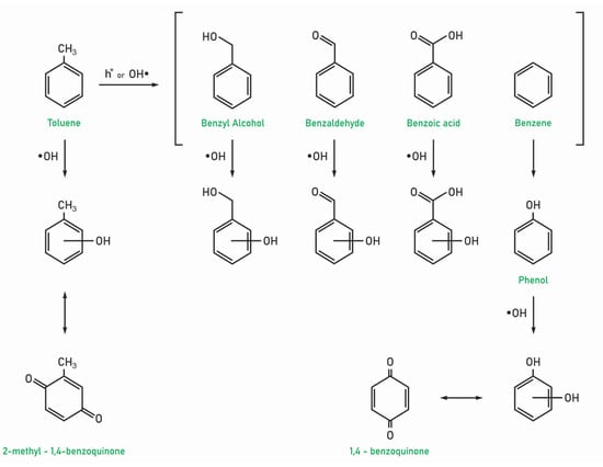 Possible pathways of hydroxylated byproducts formation are presented in Figure 4. Using quantum chemistry, Frankcombe and Smith investigated the toluene oxidation reaction pathway and determined that ketone intermediates are likely formed during the reaction (toluene oxides) to cresols [15]. Other authors observed the formation of ketones such as 2-methyl-1,4-benzoquinone at trace concentrations [61,62].