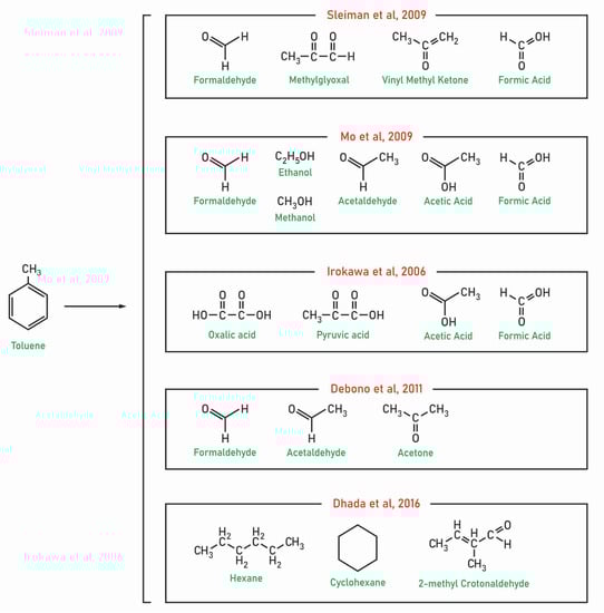 In the following sections, other by-products in the gas- and solid-phases compounds are reported during PCO of toluene. In our review, we present the names of organic compounds, experimental conditions, and other parameters exactly as they are given in the corresponding articles.