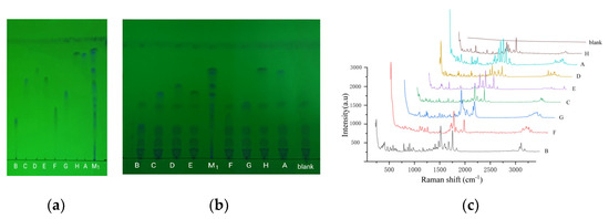 TLC and Raman spectra diagram of eight quinolones. (a–c) TLC diagram of 8 reference solutions, TLC diagram of mixture of the reference and food, and Raman spectra diagram of 8 quinolones, respectively. A, B, C, D, E, F, G, H, and M1 represent the eight quinolone reference solutions and the mixed reference solution 1, respectively; “blank” represents the liquid product solution without any quinolones.