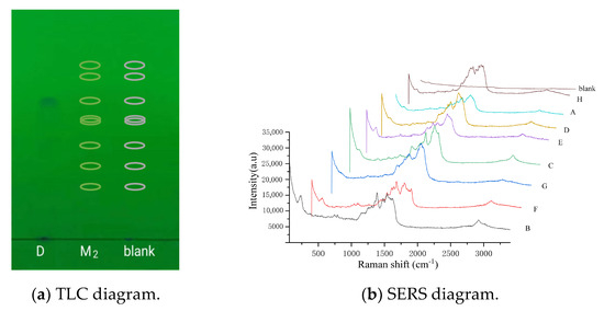 Analysis based on Raman spectroscopy is a new method that can be used for the rapid detection of the chemical compositions of food. The results of Raman spectroscopy show the inelastic scattering of compound molecules after being irradiated using a laser, so the fingerprint structure information of the constituent compounds can be reflected by Raman spectroscopy. Additionally, Raman spectroscopy is almost unaffected by water and silica gel under experimental conditions. Although this method is highly specific, its sensitivity is relatively low. To meet the requirements for the analysis of some trace components, the sensitivity can be increased by more than 104 times through surface-enhanced Raman spectroscopy (SERS) [10,11,12,13]. SERS technology provides molecular fingerprints with high-specificity and high-sensitivity spectral features and has been widely applied in the field of analysis. For example, SERS technology can be used for the specific detection of quinolone residues when harmful residues have been preliminary separated in dietary supplements or food using TLC [14,15,16,17,18,19,20].