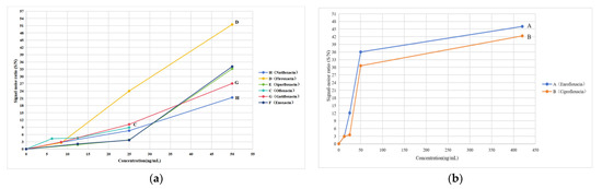 With the proposed method, a gradient concentration range of the solution should be used to determine the limit of detection (LOD), including the MRL (ng/mL) of quinolones in food. For example, the MRL of nadifloxacin (H) in food is 5.00 μg/kg, which is equivalent to 20 ng/mL of nadifloxacin in the sample solution. The concentration range of the reference substance (H) was 8.5~50.0 ng/mL. Similarly, Table 2 shows that the concentration ranges of the reference substances (A, D, E, C, G, F, and B) were 12.5~420.0, 8.5~50.0, 12.5~50.0, 8.0~32.0, 8.5~50.0, 12.5~50.0, and 12.5~420.0 ng/mL, respectively.