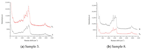 Ten batches of different varieties of aquatic products and ten batches of different animal foods were taken separately (Table 3) The corresponding twenty sample solutions were prepared in accordance with the method described in Section 3.5. Using TLC-SERS (Section 3.7), 10.0 μL each of the fleroxacin (D) reference substance solution and mixed reference substance solution 2 as well as twenty batches of the sample solutions were separately dropped onto the same GF254 thin-layer plate. The detection results show that no SERS signal was observed in any sample, except for samples 3 and 8. The SERS values of samples 3 and 8 were the same as those of enrofloxacin (A) and ciprofloxacin (B) in the mixed reference substance solution 2, respectively. Figure 5 shows that the characteristic peaks of sample 3 were higher than those of the reference substance A, and the characteristic peaks of sample 8 were weaker than those of the reference substance B. This finding indicates that the content of enrofloxacin (A) exceeded the MRL (100 µg/kg) in sample 3, and the quinolone contents (A, B, C, D, E, F, G, and H) did not exceed their corresponding MRL in the other samples. That is, according to China’s national food standards, of the twenty batches of samples tested using TLC-SERS, except for enrofloxacin (A) in sample 3, the levels of the eight quinolones in the other samples were all below the limit.