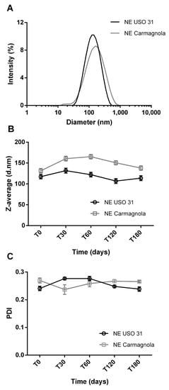 2.2. Characterization and Physical Stability over Time of C. sativa EO-Based NEs