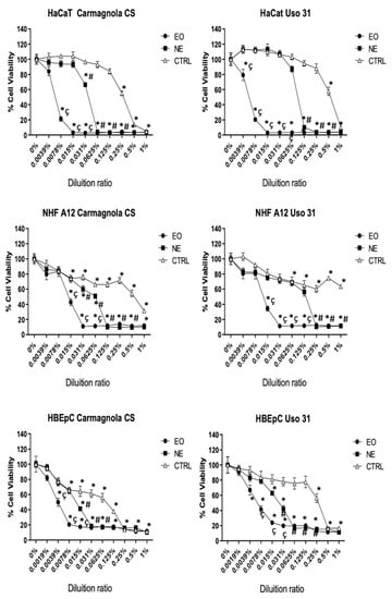 2.3. Evaluation of C. sativa EO-Based NEs’ Safety Profile in Human Cell Lines