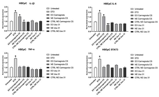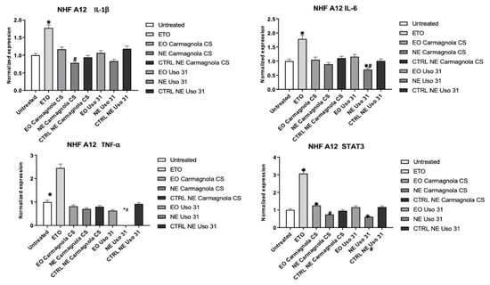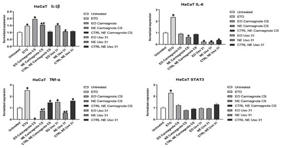 2.4. Evaluation of C. sativa EO-Based NEs’ Effect on Inflammatory Condition of Human Cell Lines