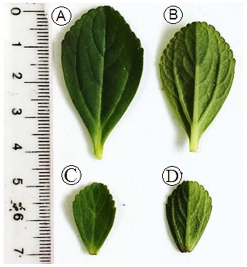 Leaves isolated from Plectranthus ornatus boldo. (A)—adaxial face from specimen Barcarena. (B)—abaxial face from specimen Barcarena. (C)—adaxial face from specimen Quatipuru. (D)—abaxial face from specimen Quatipuru collected in different sizes throughout the first and fifth internodes.
