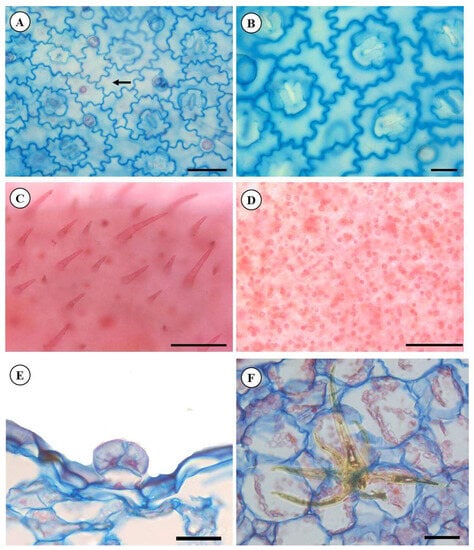 Front view of leaf blade P. ornatus Codd. (A–D). (A)—General view of the adaxial side and cells showing sinuous anticlinal walls (arrow). (B)—Diacytic stomata detail on the abaxial side. (C)—Overview of pluricellular non-glandular trichomes. (D)—Overview of glandular trichomes. Cross-sectional area (E,F). (E)—Glandular trichomes with a small petiole. Scale bar: 50 μm (B,E,F), 50 μm (A,C,D).