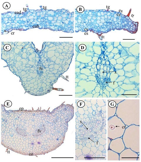 P. ornatus Codd. Cross section of the leaf blade. (A)—Front view of homogeneous mesophile. (B)—Foliar Boldo showing glandular trichome. (C)—Midrib. (D)—Collateral vascular bundle detail in the midrib. (E)—Overview of the petiole. (F)—Collateral vascular bundle detail of the petiole. (G)—Crystals of calcium oxalate. Legend: ac—angular collenchyma, cr—calcium oxalate crystals, ade—adaxial epidermis, abe—abaxial epidermis, ep—epidermis, st—stomata, sc—substomata camera, vb—vascular bundle, p—phloem, x—xylem, ngt—non-glandular trichome, gt—glandular trichome. Scale bar: 100µm (A,B,D), 200µm (C,F,G), 500µm (E).