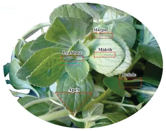 The samples (Figure 1) of the leaf blade were sectioned into the regions used in the anatomical study (margin, midrib, and petiole), fixed on FAE (formaldehyde, acetic acid, and ethanol 50%) [47] for 24 h for the structural study, in hydrophilic substances for histochemical tests, in NBF (neutral-buffered formalin) for 48 h for lipophilic substances [62] and stored in ethanol 70%. Figure 5 displays the image of the leaf sections of Plectranthus ornatus.